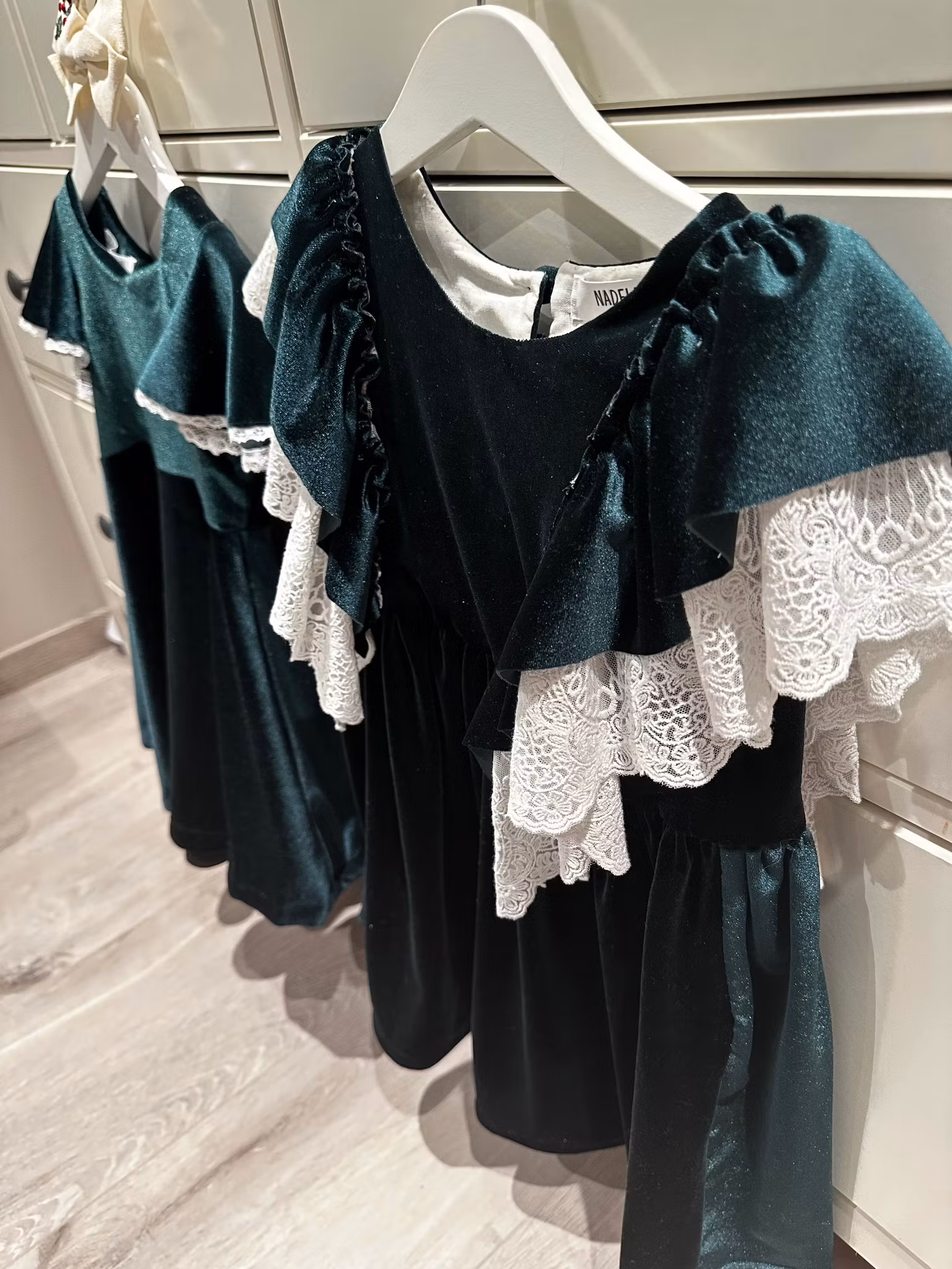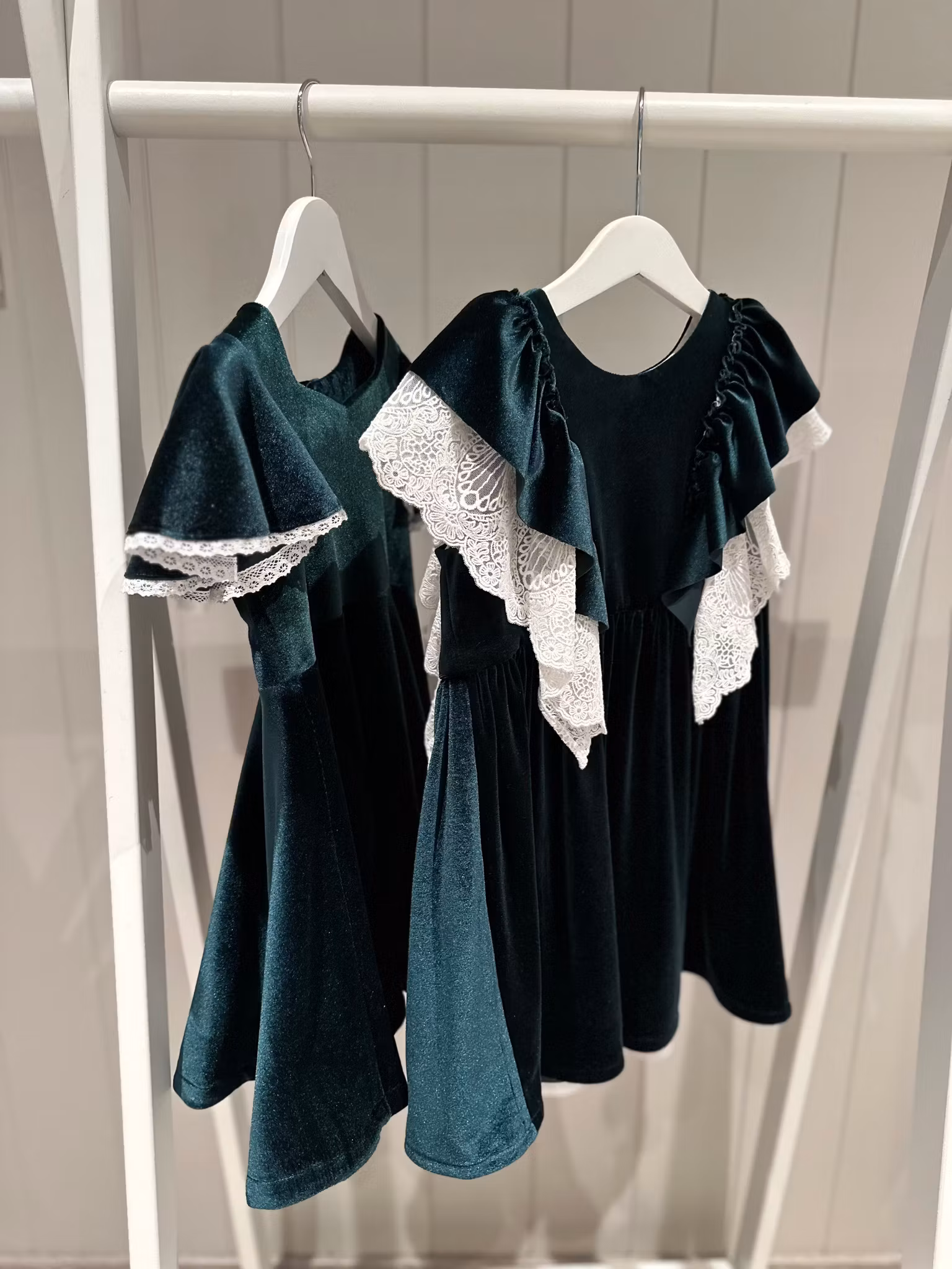 Kjolen er i nydelig smaragdgrønn velourstoff.Kjolen har fôret overdel med knapper i ryggen. Blondene på overdelen gir kjolen det lille ekstra.Avgift inkludert.