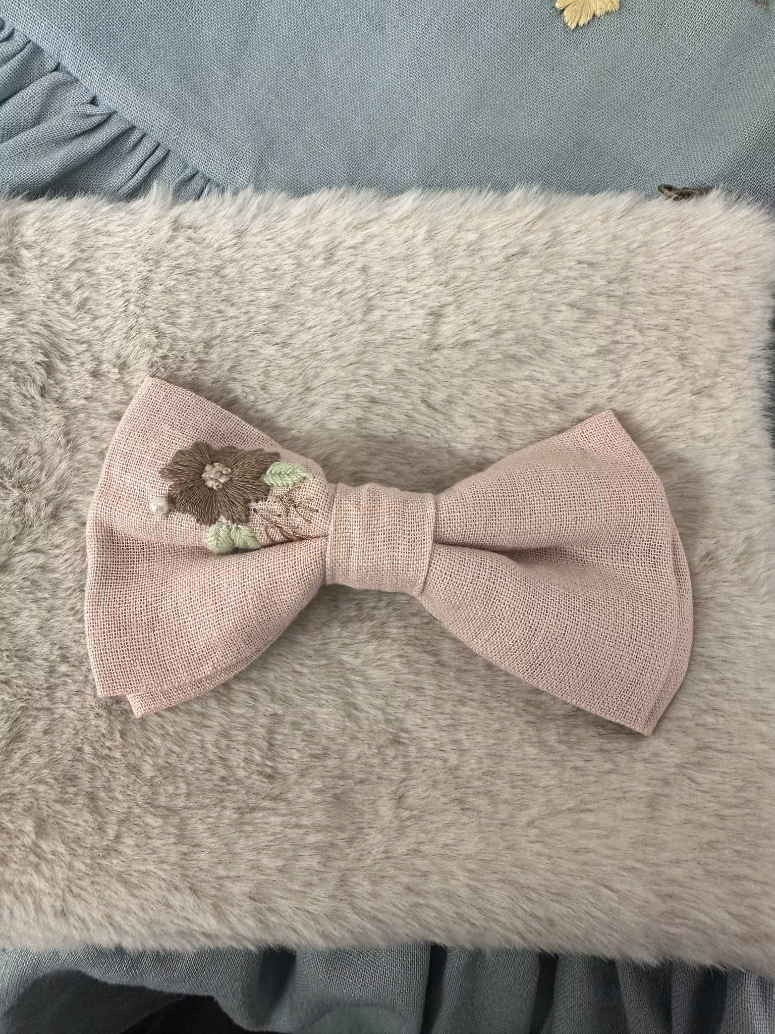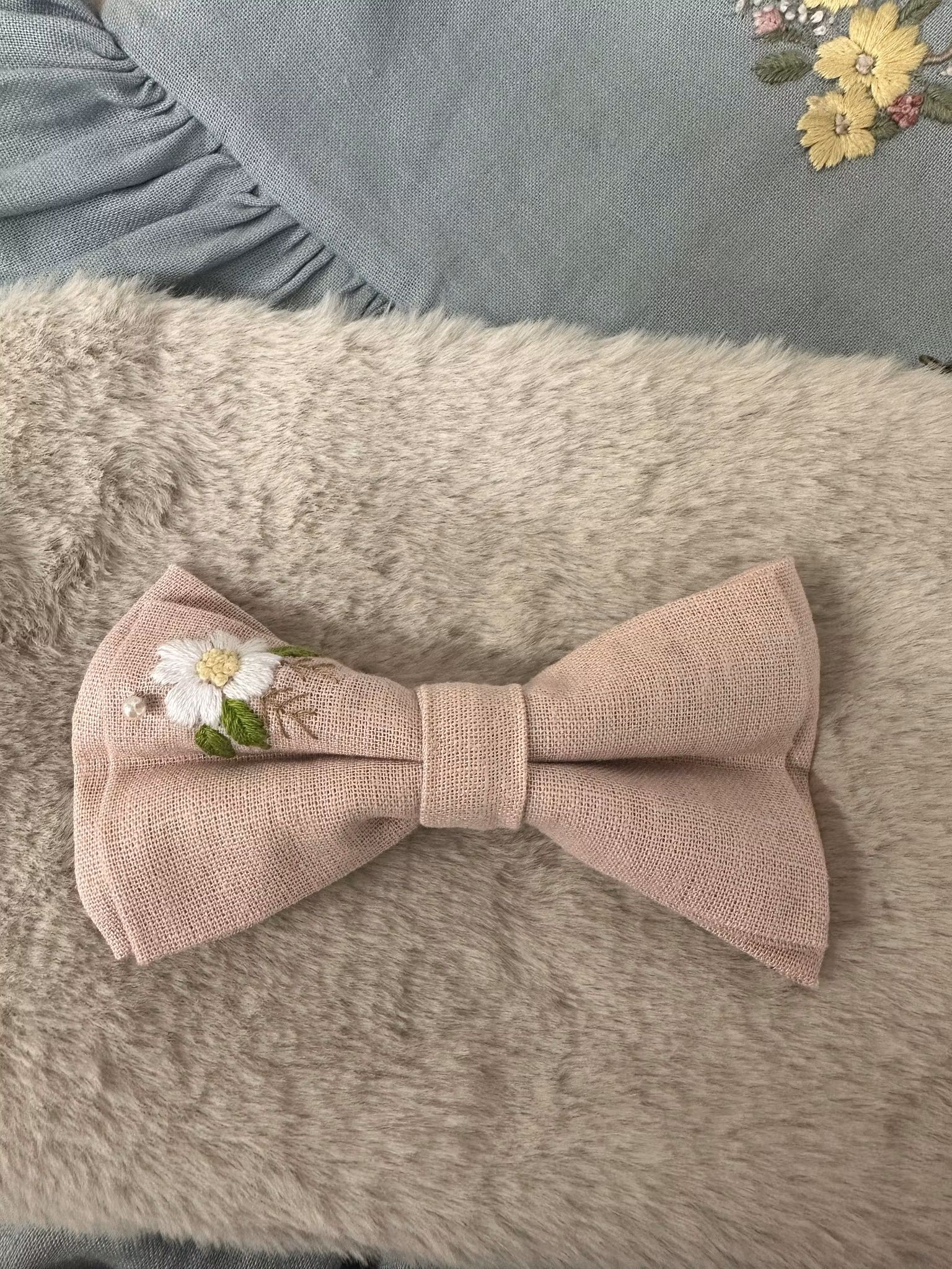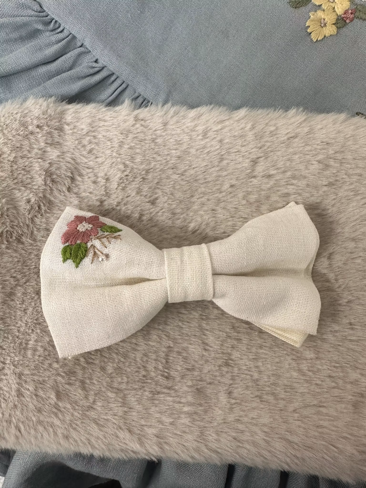Håndbroderte hårsløyfer laget i linstoff, med alligator klype i liten størrelse.