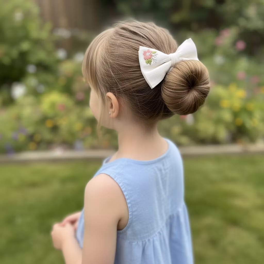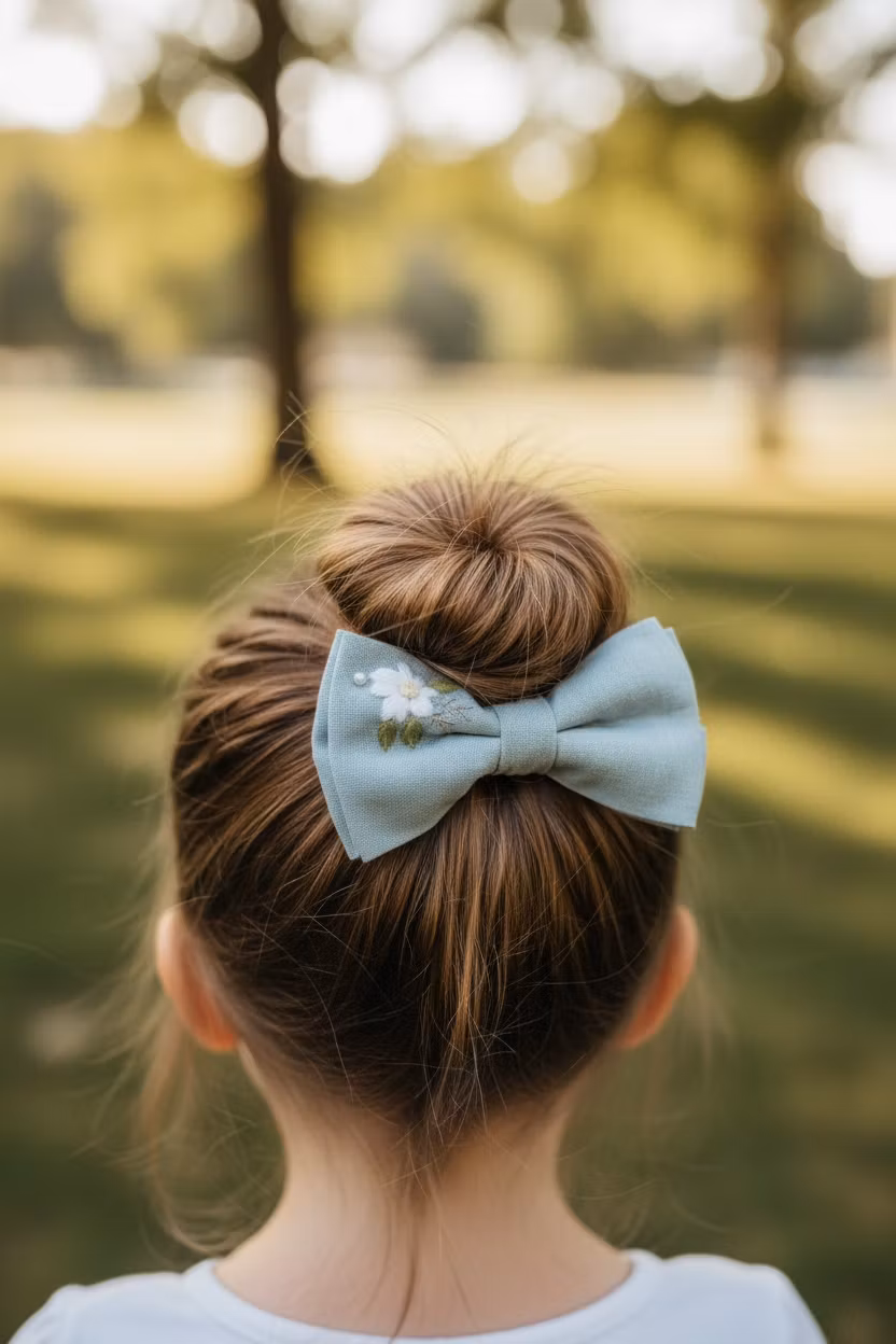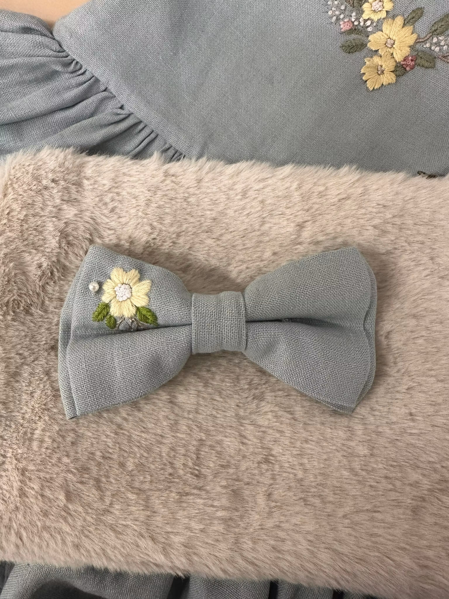 Håndbroderte hårsløyfer laget i linstoff, med alligator klype i liten størrelse.