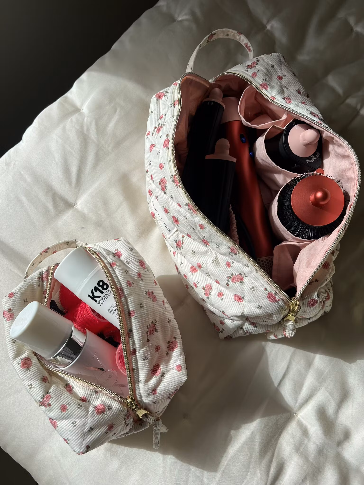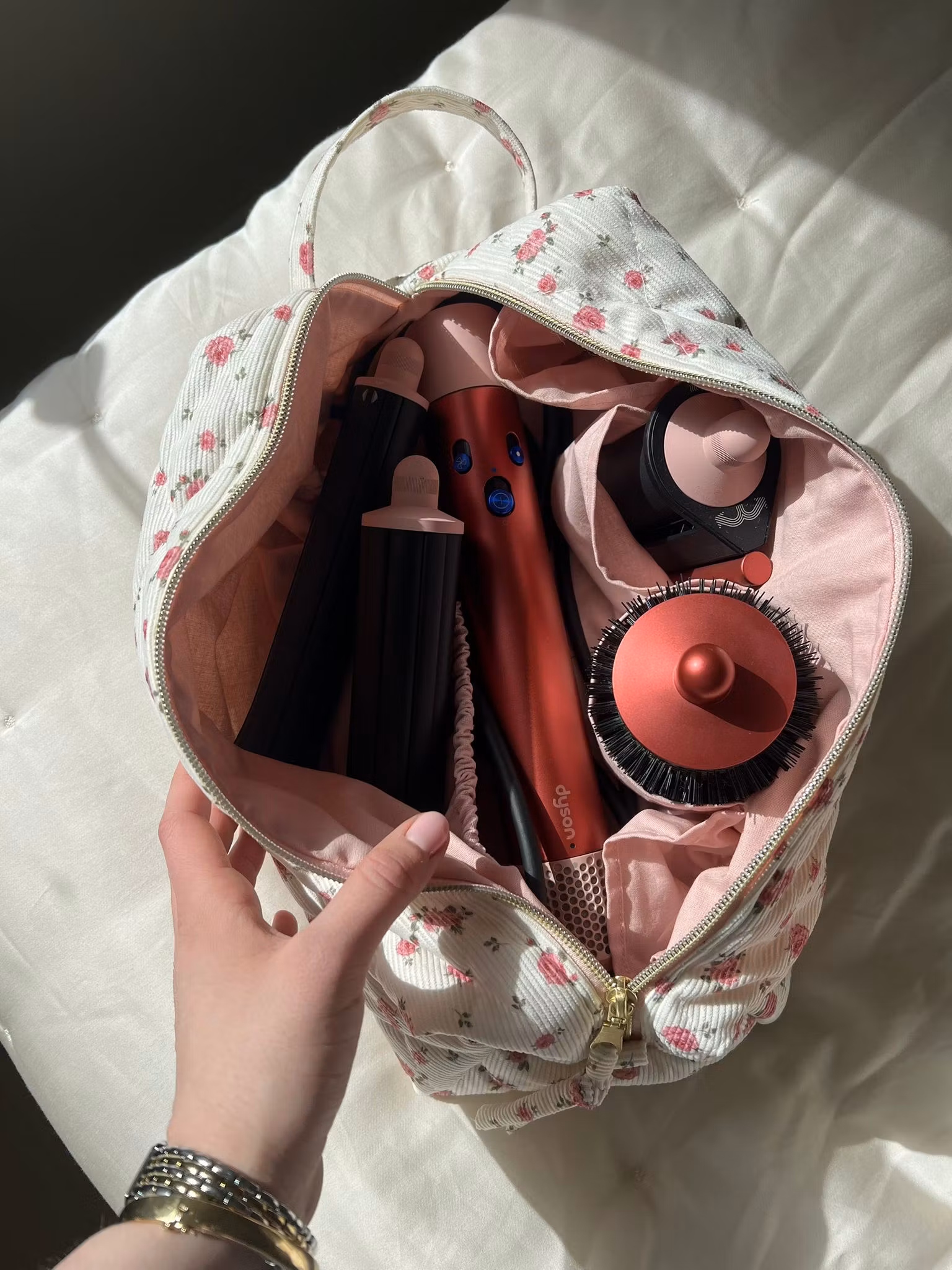 Denne nydelige reisevesken er perfekt til ditt Dyson hårverktøy og alt tilbehør. Med et delikat blomsterdesign og myk innside beskytter den apparatet ditt samtidig som det ligger trygt og organisert – enten du er hjemme eller på reise.